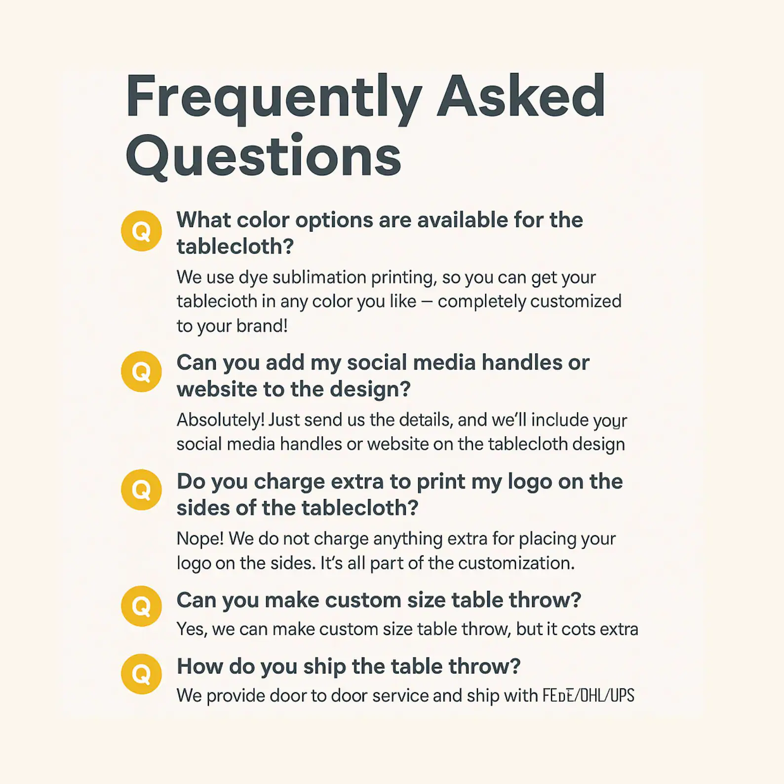 Crafted from premium 100% polyester fabric, it’s machine washable, durable, and designed to protect your table from scratches, spills, and daily wear. Your artwork or logo can be printed in full color on any side of the table throw—front, back, left, right, or top—based on your layout needs.